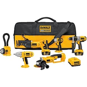This contractor-grade kit includes six versatile, ultra-powerful 18-volt lithium-ion tools. The DCD970 cordless hammerdrill/drill/driver screws in virtually any building material: wood, plywood, composites, plastic, metal, steel, and even poured concrete, stone, and concrete block. It delivers 450 units watts out of power and features a patented 3-speed, all-metal transmission and -1/2-inch self-tightening chuck. The DC827 impact driver is a professional-duty power-screw-driving tool that features a compact, ergonomic design. This -1/4-inch-hex-drive tool weighs just 3.7 pounds. The DC385 cordless reciprocating saw features a high-performance, variable-speed motor that drives the blade at 0-3,000 strokes per minute with an aggressive-cutting stroke length of 1-1/8-inch. The DC411 cordless cut-off tool is powered by a high-performance 6,500-RPM motor--a no-nonsense tool is perfectly engineered to cut and grind metal. From rusted rebar and steel I-beams to resilient threaded rod and corroded angle iron, its abrasive wheel will slice through most metals quickly and cleanly. The DW059 impact wrench is a -1/2-inch-drive, high-torque tool that weighs 6.6 pounds measures 10-3/4-inched long, and is specifically designed for the toughest, demanding fastening jobs, such as tightening giant hex-head bolts, loosening stubborn lug nuts, and power-driving the longest, fattest lag screws imaginable. Brighten up dark, shadowy spaces with the DC919 flexible floodlight. The DCK675L six-tool cordless combo kit also includes two 18-volt XRP lithium.-ion batteries, fast one-hour charger, 360-degree side handle, Type 1 wheel and safety guard, Type 27 safety guard, wrench, backing flange, two-position side handle, and soft-sided storage bag and is backed by DEWALT’s 90-day money-back guarantee, full one-year service contract, and three-year limited warranty.